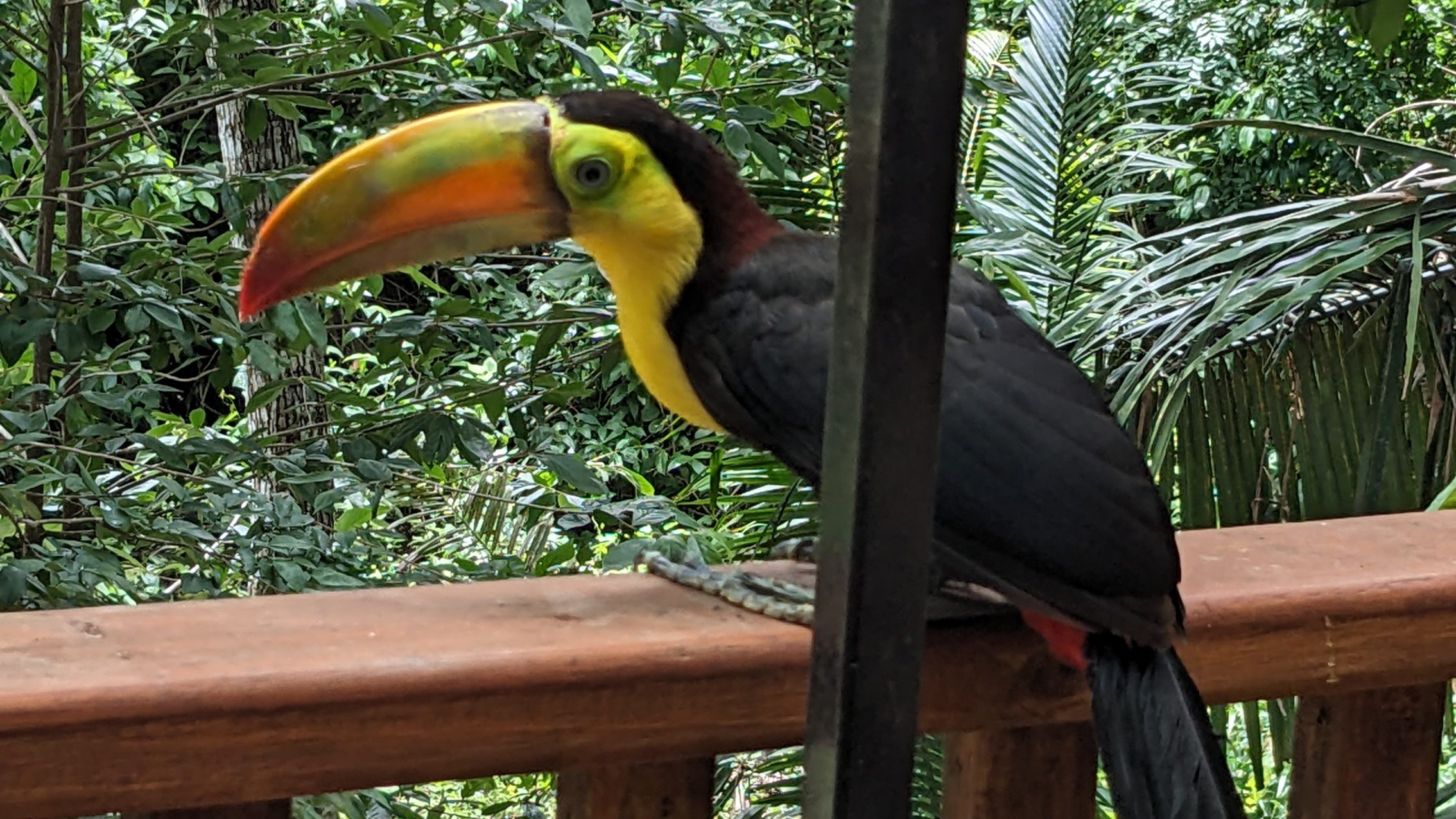 You know the sound when a bird flies into your window? This did not sound like that. TTHHUUUMMMPP!!!! RUSTLE RUSTLE FLAPFLAPFLAPFLAPFLAP. Imagine standing bare-assed about to shower, and suddenly hearing what sounds like somebody throwing a softball at the window, just inches from your face. Startling, to say the least. I peeled the curtain back a few inches to see what could possibly be the cause of all this commotion. Just a few feet away in a neighboring tree, a juvenile Keel-billed Toucan sat looking confused as to why it had just bounced off the house. At only 10′ away, I could clearly see he wasn’t injured; his bill looked fine, his feathers weren’t ruffled, and he hopped around in the tree with ease. Then off he went again, flapping and trying his best to enter the house, this time through the kitchen window. He swooped around and landed on the railing by the front door, where he rested and pondered his next move. Slowly over the next 20 minutes or so, this completely wild animal systematically tested all the windows and doors to see if he could fly in and explore. In particular, our new friend seemed to like the back porch, which has a canopy over it, and lots of potted plants with plenty of bugs to eat.