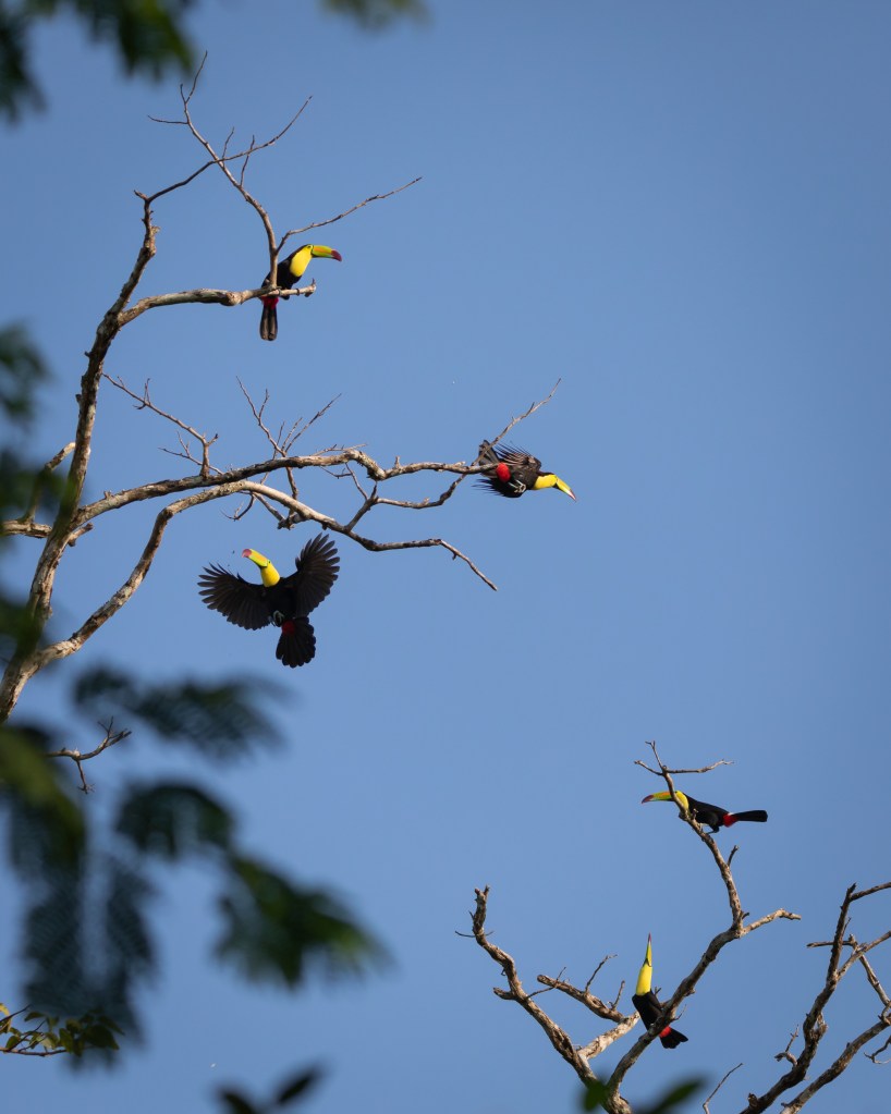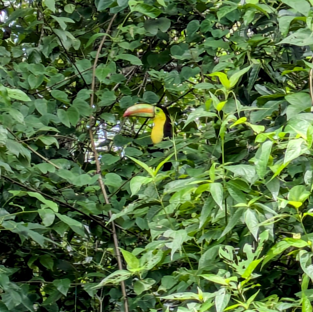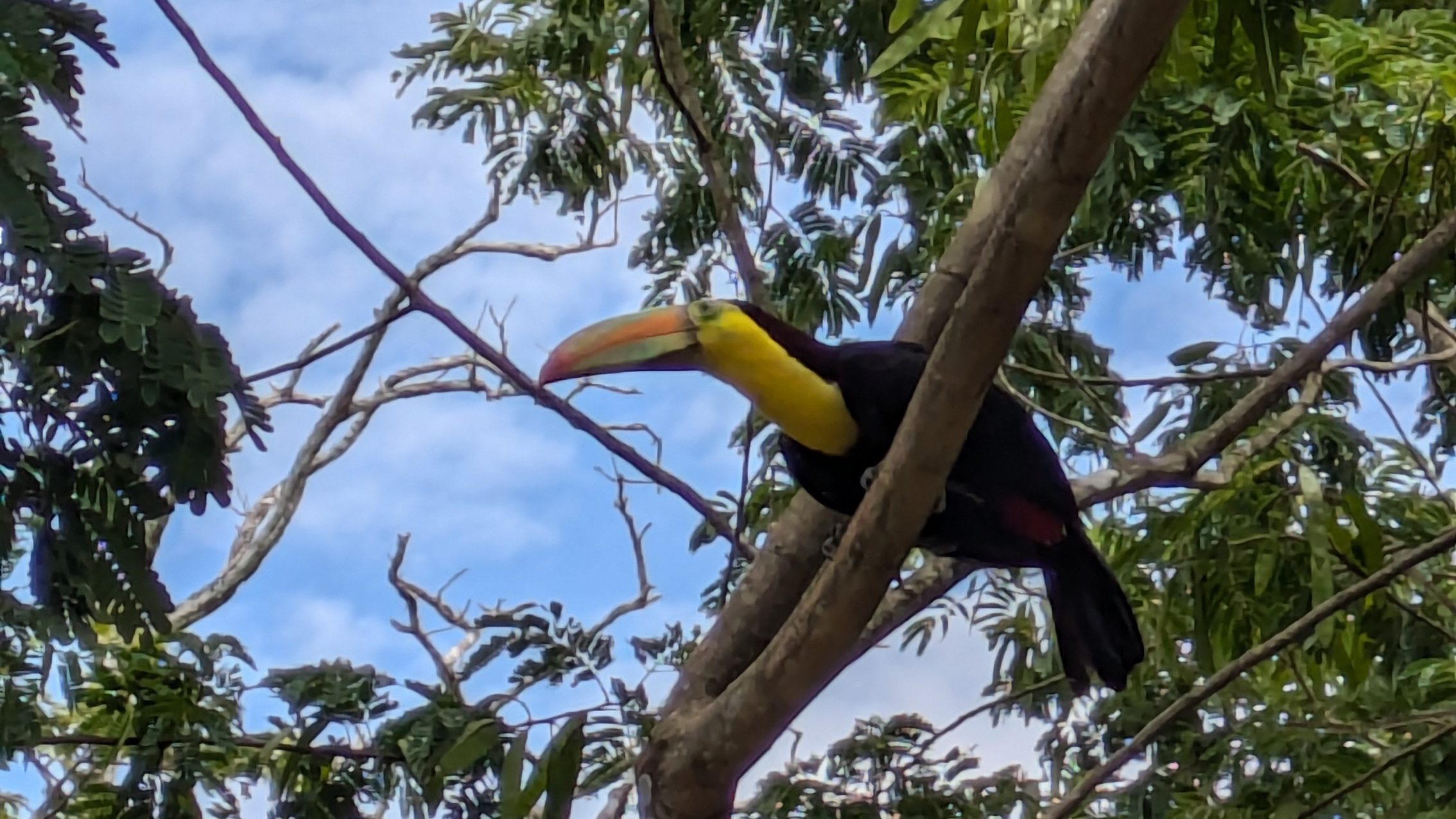 So what do you do if you find a bird acting funny? You call the experts immediately. We spoke with Nikki Buxton, Founder and Managing Director of Belize Bird Rescue. She requested we switch our call over to WhatsApp so she could make a few quick calls about our new friend. She also wanted a location pin of where the bird was found, and any pictures and video so she could attempt to assess if the bird was as healthy as we hoped. It was amazing to connect with a true wildlife steward who was willing to immediately prioritize an individual juvenile bird and offer to rehab it if needed. Luckily, she determined from our video that the bird was unharmed and in fact seemed well fed, with great plumage, healthy tail feathers, and no signs of injury. She also confirmed the bird was young- apparently blue eyes are a dead give away for juvenile Keel-bills. She noticed how unafraid it seemed of humans, which bolstered the theory it might have been hand-fed as a chick, or perhaps that it recently escaped captivity. She mentioned that she knew of two other juvenile Keel-bills that had recently been rehabilitated in our general area, but was able to quickly determine from her phone calls that the person planning to release those two birds hadn’t yet- this was a third toucan who we knew nothing about. They are by nature very inquisitive birds, so it was impossible to determine just from a brief encounter the bird’s likely origin story- he might have just been curious. The entire time, our new friend was hopping about and eating bugs in trees, oblivious to the great discussion and sudden excitement it caused by bouncing off the bathroom window. In honor of the excitement, the noise, and the general derailing of our morning, we named our new Toucan friend “Ruckus.” We followed down the driveway as Ruckus spent the next 10 or so minutes flying to various trees and bushes around our little slice of Belize, before eventually ending up in the top of a tall mahogany tree. What a strange and beautiful creature. I watched as Ruckus rested for a few final minutes before taking wing and disappearing in a bright blue sky, full of puffy clouds.