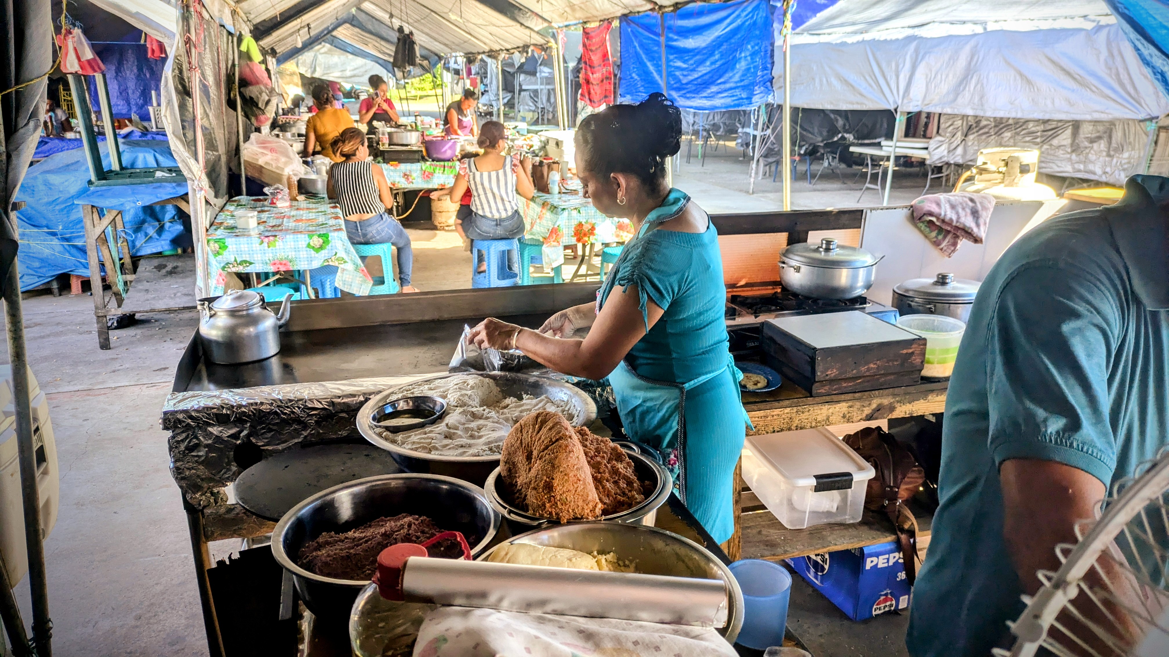 If we’re being honest, my Spanish sucks. I would describe it as barely passable traveler’s Spanish mixed with some basic kitchen Spanish from my time in the hospitality industry in Chicago, where a huge Mexican population lives and thrives. I always say that about the time I leave a Spanish speaking country, what I order in a restaurant and what I actually get in a restaurant start being the same thing. Lo intento. No issues today though. The man I’ve been talking to is Juan, and he speaks a lot more English than I speak Spanish, much to his credit. His wife, for which the eponymous Pupuseria Damaris is named, helms the kitchen and is clearly in charge of the operation. Her hands move so quickly they blur, as she fills pupusas, cooks quesadillas, and rolls burritos all while greeting her friends as they stroll through the market.