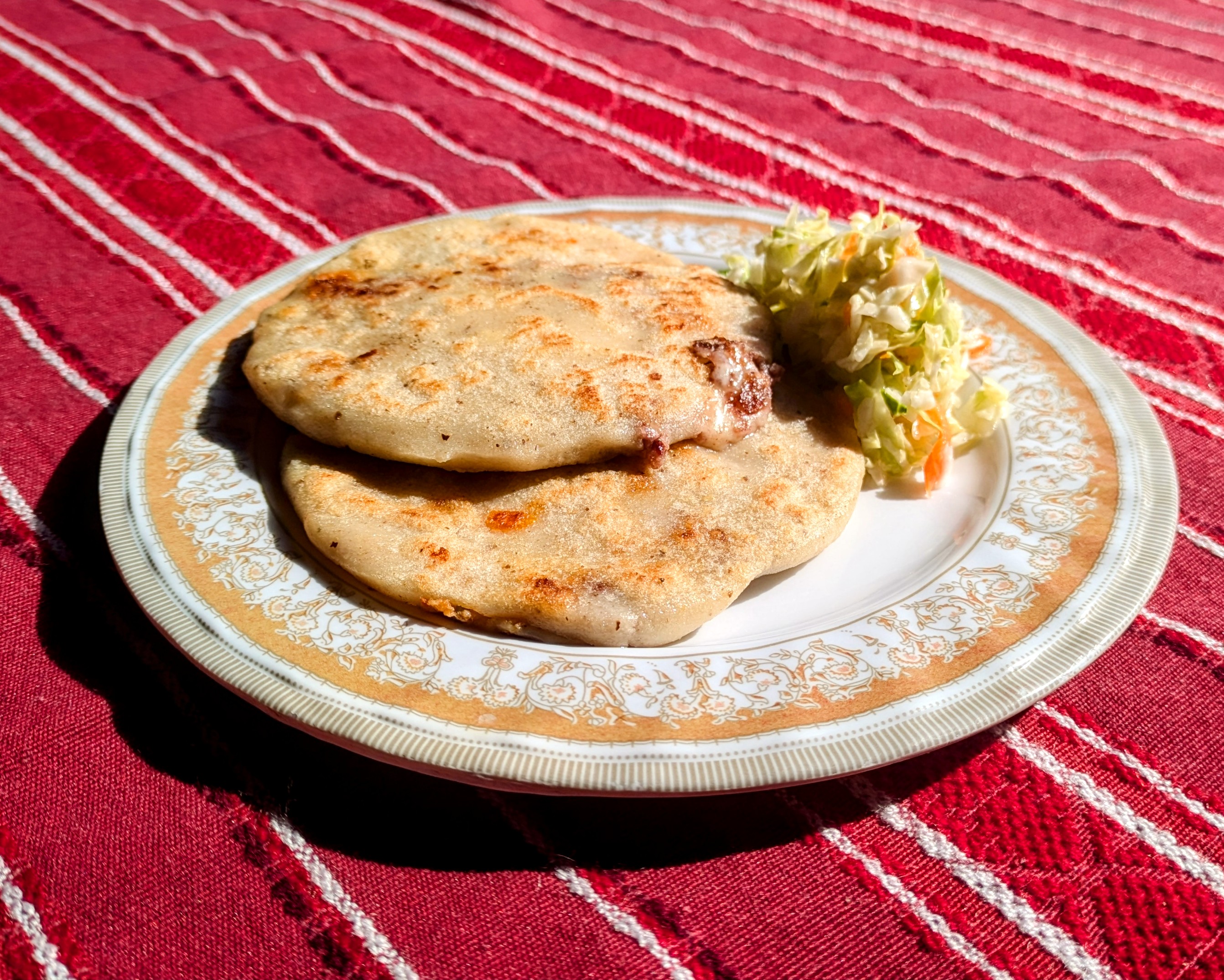 “Buenos Dias!” I say cheerfully. The woman behind the counter looks up at me, clearly busy, and gives me an expression that lets me know she’s ready to receive my order. “What’s your favorite thing on the menu?” I ask. She looks over to the man next to her, and they converse in rapid Spanish in low voices. He translates between us. “She says you will try them to find your favorite.” He cocks his head to the side and looks at me curiously. “You speak Spanish?” “Lo intento,” I say with a grin, “but not well…. at all.” He replies with a smile and an encouraging nod. It’s time to order. “Puedo tener dos pupusas porfa,” I manage. The man smiles and turns to the woman, speaking in low tones once again. She smiles at me, nods and dutifully begins. She hasn’t stopped moving the whole time.