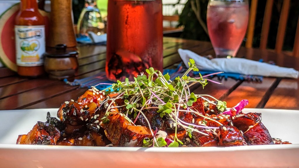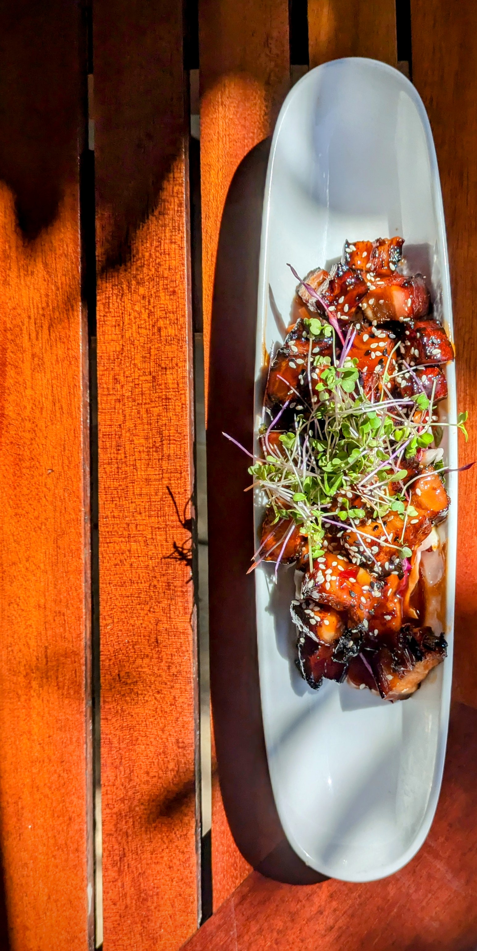 slow-cooked pork belly drenched in sticky Asian sauce, served with chopped slaw