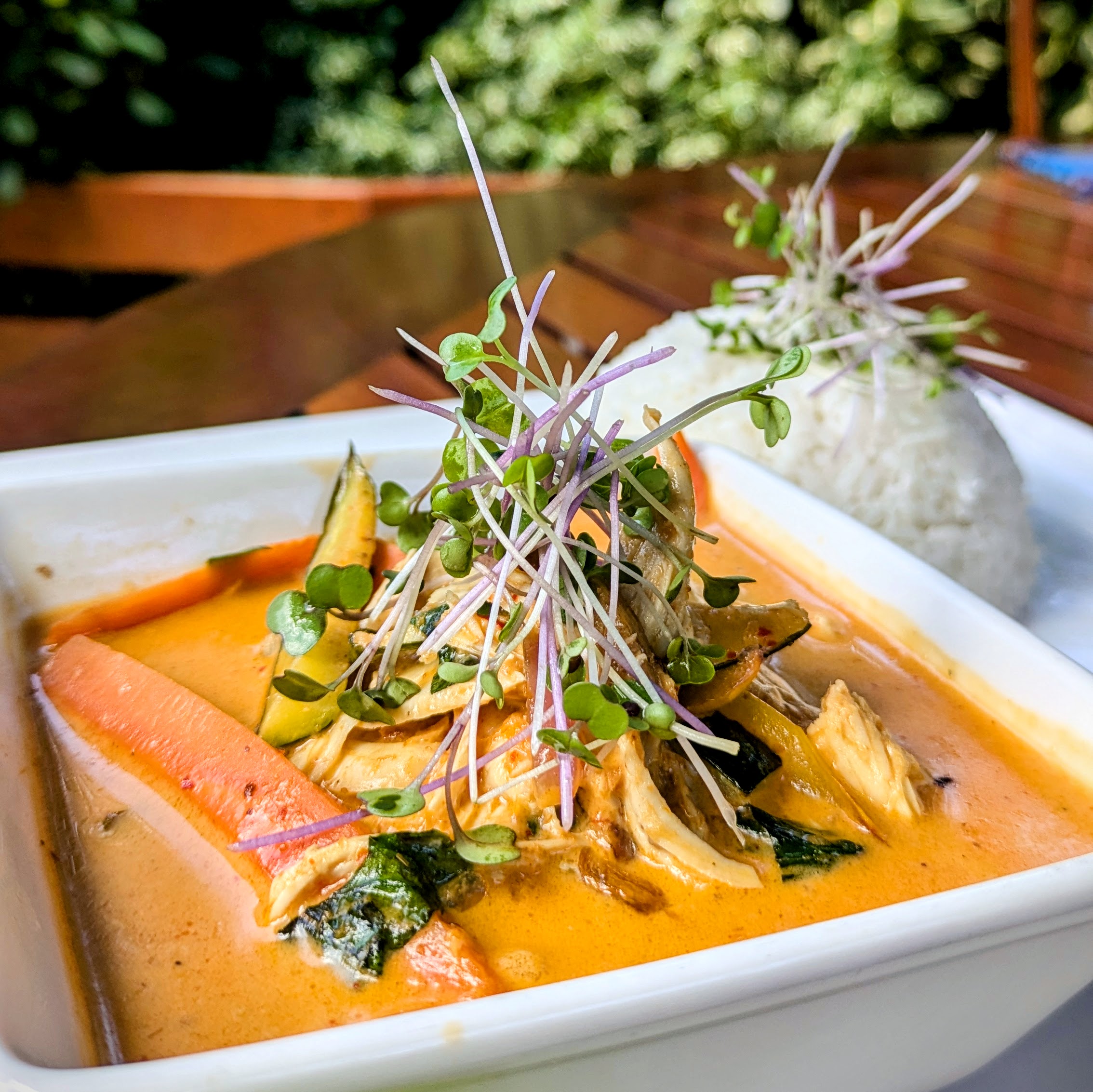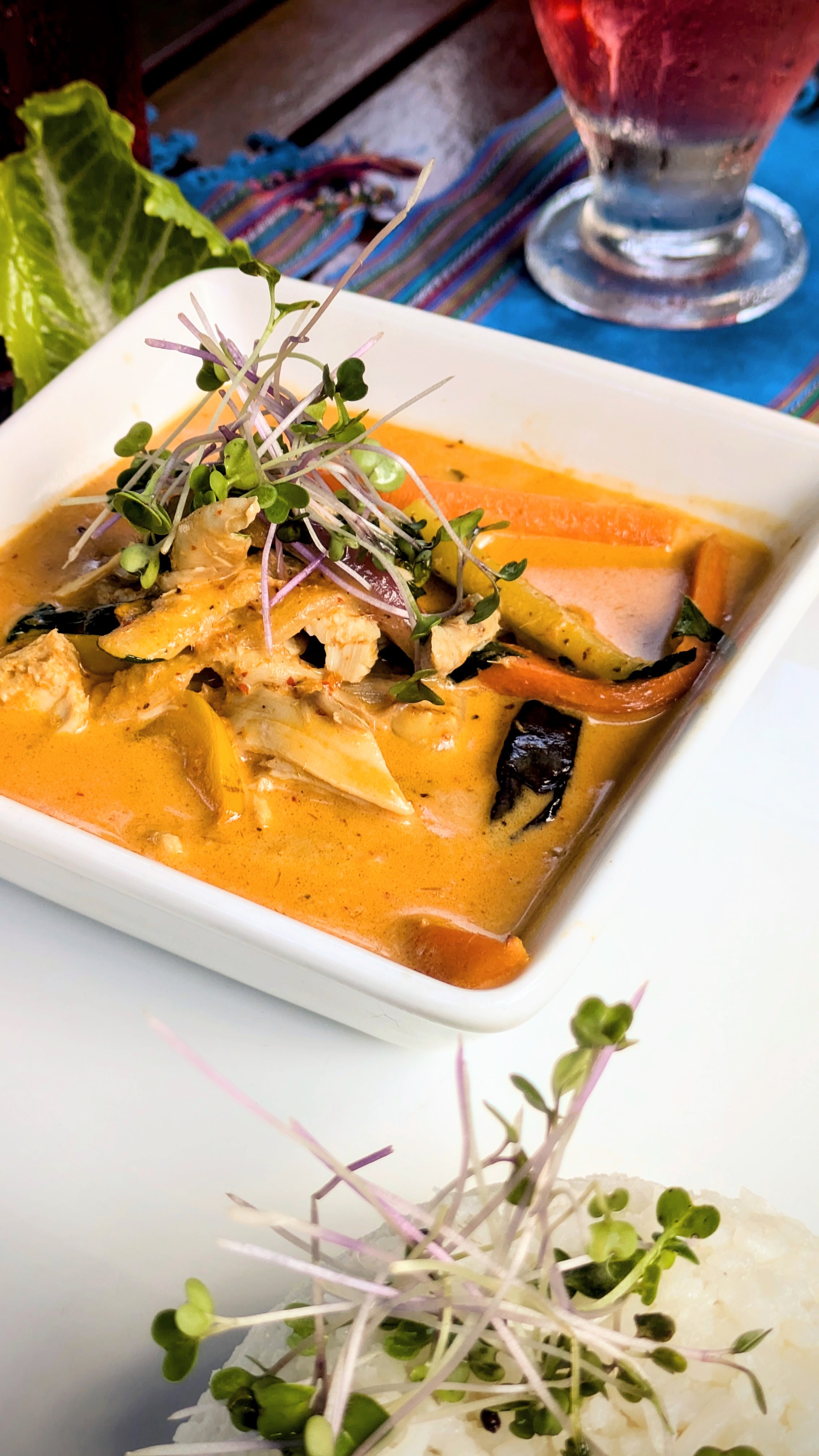 chicken and veggies in a silky-smooth coconut milk, served with coconut rice