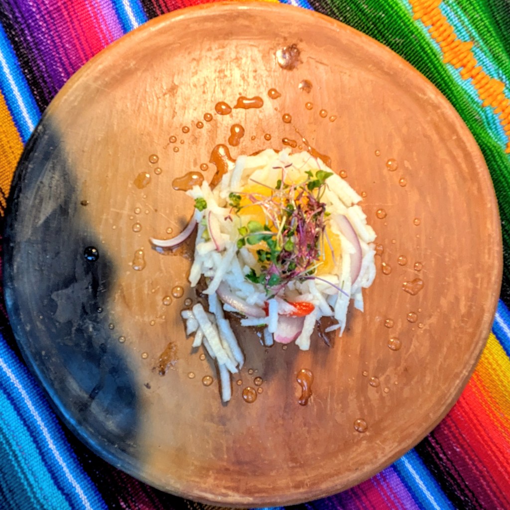 Julienne jicama, onions, cilantro-roasted peppers, grilled pineapple marinade, with drizzled white balsamic reduction