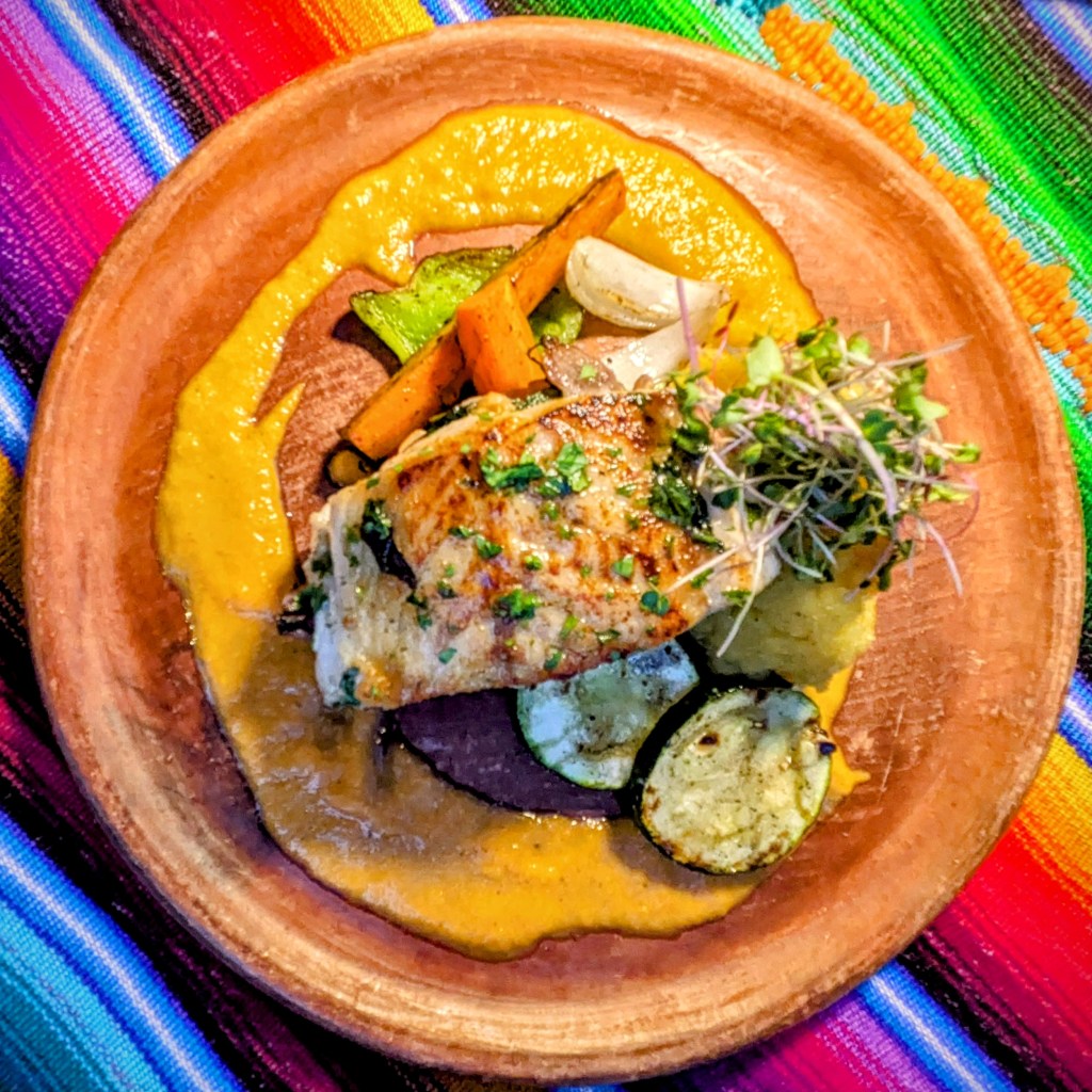 Chaya, onion, garlic and smoked pineapple-stuffed fillet of fish, with grilled vegetables, sweet potato mash and roasted tomato sauce