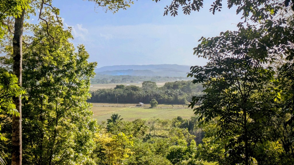 Up and down through the jungle we drove, all the way to the highest point in the reserve. We reached a clearing near a small Maya mound, from which you could faintly see El Castillo, the central structure at Xunantunich, a few miles away. This is a special location that can be used by guests for romantic dinners, proposals, or even wedding ceremonies. The views are exquisite and the breeze blows freely through the trees atop the hill. In the distance, you can see the hills of Guatemala, and in the foreground, the Maya Farm.
